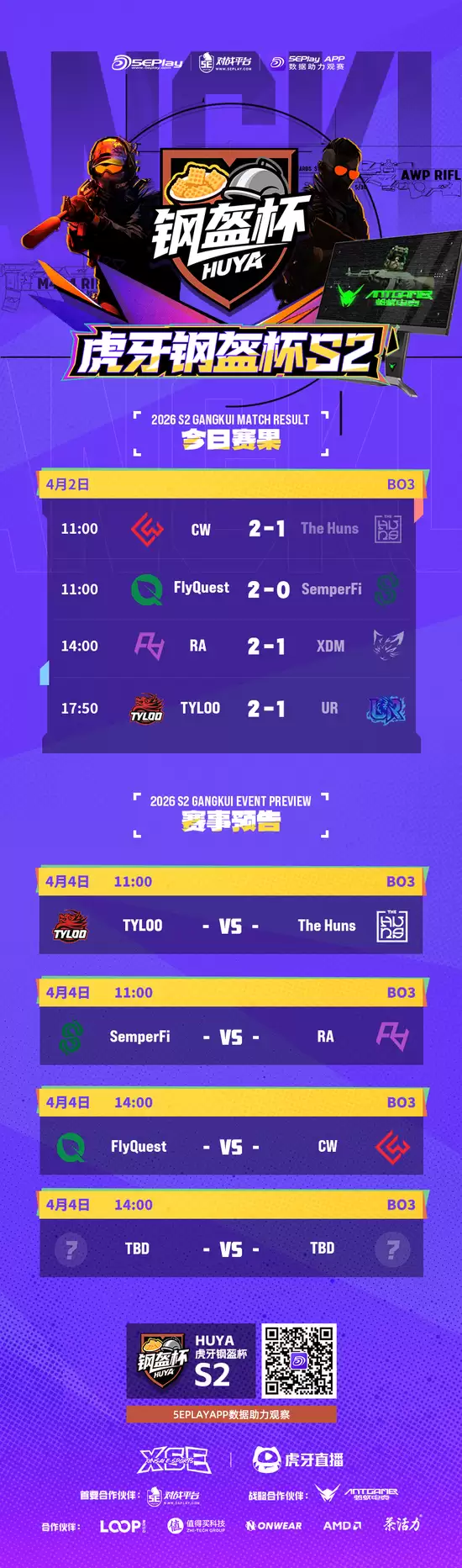 钢盔杯 S2第三日将于4月4日11:00正式开始,TYLOO迎战The Huns,RA则是迎来澳洲队SemperFi挑战,这两场比赛都是生死战,胜者将会在当日14:00进行败者组半决赛的比拼。