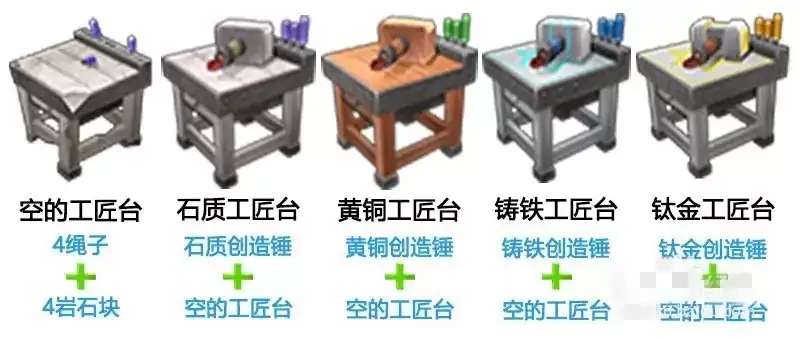 1、准备好制作钛金创造锤的材料:钛合金锭*3、小木棍*4,空的工匠台制作材料:绳子*4、岩石块*4;2、将制作完成的钛金创造锤和空的工匠台进行合成,即可获得钛金工作台。