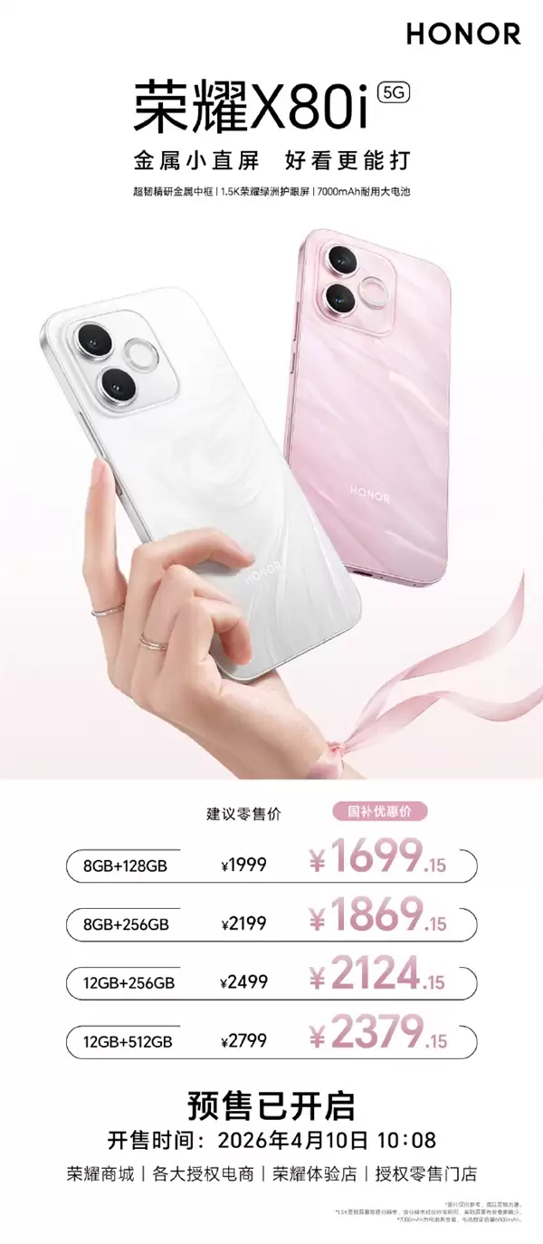 荣耀X80i近日上市并开启预售,售价1999元起,国补后到手价1699.15元起,将于4月10日正式开售。