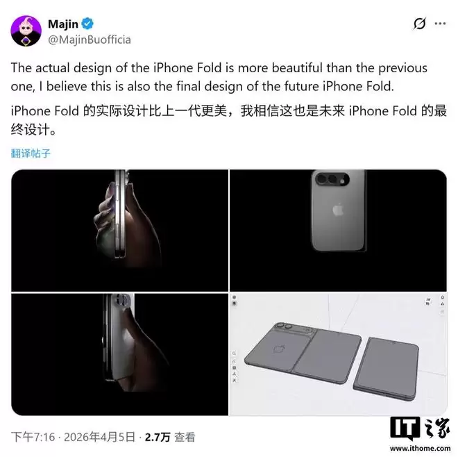 IT之家 4 月 7 日消息,消息源 Majin Bu 于 4 月 5 日在 X 平台发布推文,分享了一组渲染图,从多个角度展示了苹果首款折叠手机 iPhone Fold,并称新设计比此前版本更美观