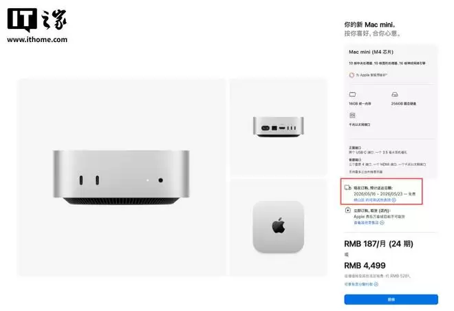 举例来说,如今在美国中国和苹果正式订购搭载 M4 Pro 芯片、64GB 内存的 Mac mini,预计发货时间为 16 至 18 周。