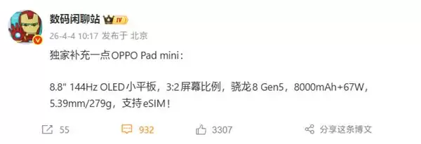 首款8.8英寸骁龙8G5小平板!OPPO Pad mini参数出炉:支持eSIM