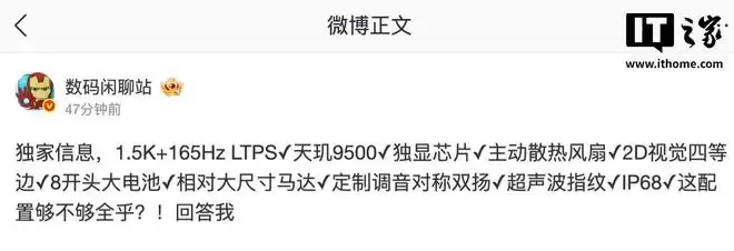 据IT之家此前援引博主 @数码闲聊站 消息,某厂天玑 9500 新机将搭载 1.5K 165Hz LTPS 屏幕,具备独显芯片、主动散热风扇,屏幕采用 2D 视觉四等边设计,具备 8 开头大电池、相对大尺寸马达、定制调音对称双扬声器以及超声波指纹,还有 IP68 防尘防水。