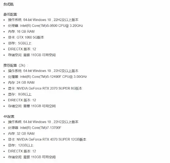 更重要的是性能门槛。如果你追求在4K分辨率下开启高画质特效,那么官方给出的推荐配置,已经指向了接近顶级的显卡级别,比如RTX 4090。这个推荐标准,无疑是为了保证游戏在最高视觉表现下,依然能提供流畅稳定的帧率体验。说白了,这是一款为次世代硬件准备的作品。