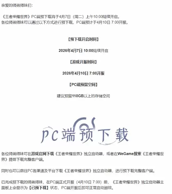 各位期待已久的玩家,请注意了!《王者荣耀世界》的预下载时间终于敲定。从4月7日上午10点开始,游戏的下载通道将陆续向玩家开放。这意味着,你可以提前把这款大作“搬”回家,做好安装准备,只待服务器正式开启,便能第一时间踏入那片广袤的世界。