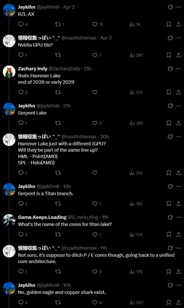 看另外此前有传闻称Intel正在推进统一核心方案,将P核与E核合并为同一架构设计,但Jaykihn明确表示,独立的P核和E核架构仍然存在,下一代P核代号为Copper Shark,下一代E核代号为Golden Eagle。