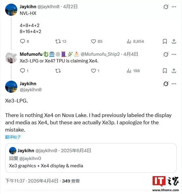 IT之家 4 月 7 日消息,综合消息人士 @Haze2K1 与 @jaykihn0 的本月爆料,Intel 英特尔在酷睿 Ultra 400 "Nova Lake" 系列处理器中将完全不涉及 "Xe4" GPU IP,新显示与媒体引擎属于 "Xe3P" 分支。