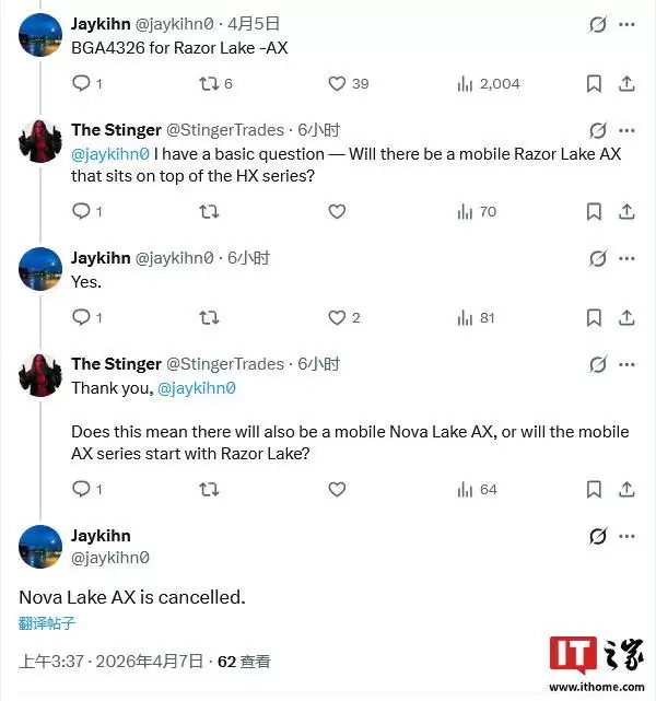 @jaykihn0 亦提到,英特尔已取消在 "Nova Lake" 中推出 "AX" 变体的计划,首个 "AX" 处理器将在后续的 "Razer Lake" 中登场。