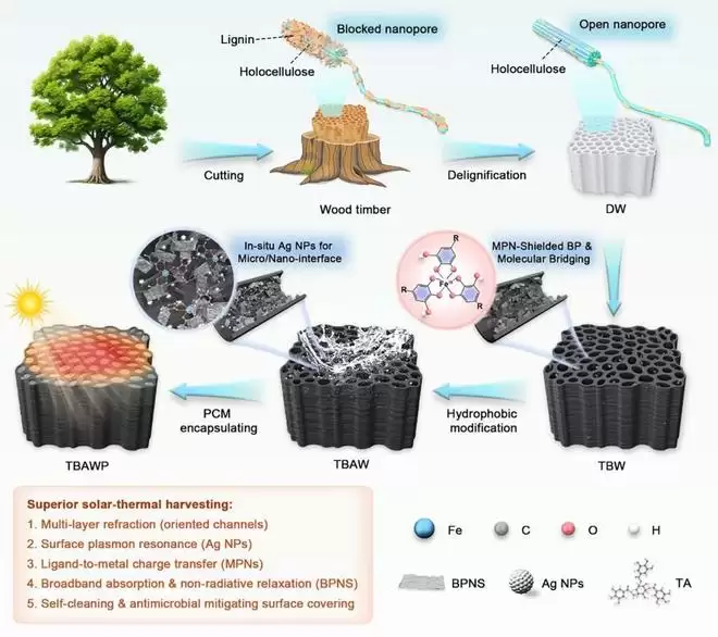 针对这一系列难题,谢德龙团队与广东工业大学教授盛鑫鑫团队合作,以天然木材的定向微通道为骨架,构筑出纳米黑磷基功能杂化界面,提出界面工程调控策略。研究人员通过在黑磷烯表面引入金属-多酚网络“盔甲”,既提升了黑磷烯的环境稳定性,又增强了其与相变材料的界面结合力,实现了结构与相容性的双重优化。