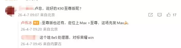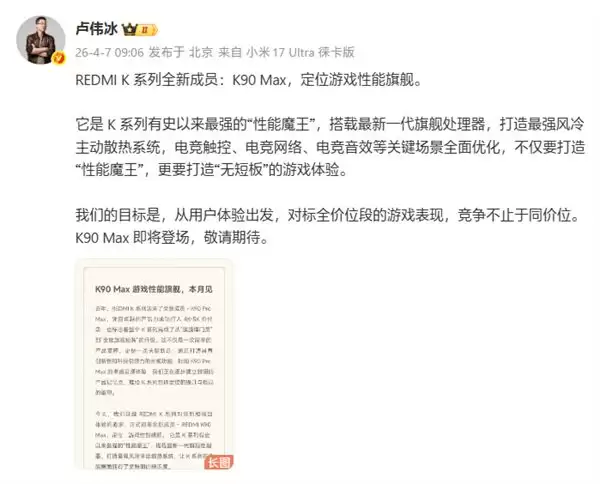 卢伟冰确认:REDMI K90 Max不是至尊版!定位更高