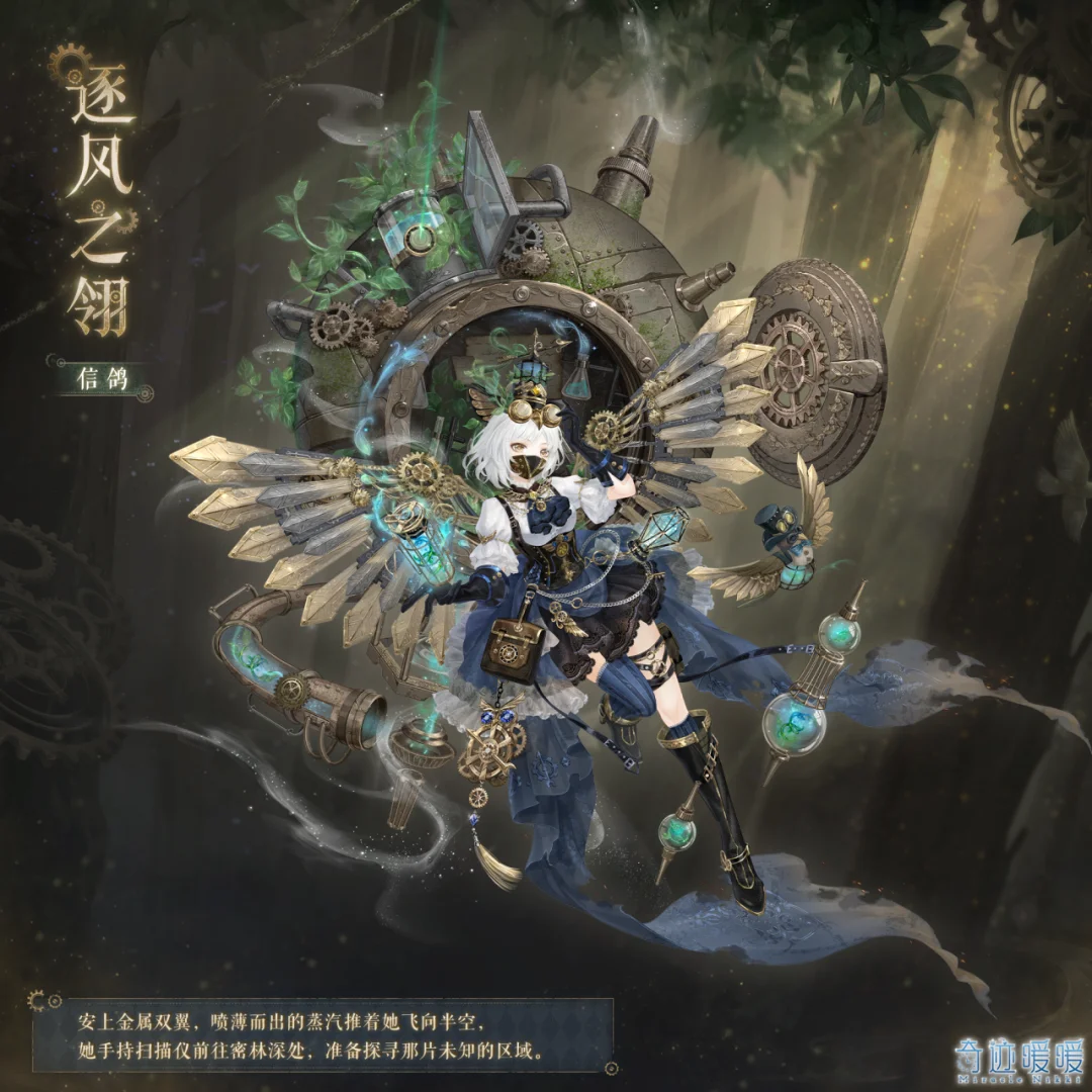 装备上铿锵作响的金属飞翼,凭借澎湃的蒸汽动力,她便能够冲向云霄。【逐风之翎】套装刻画的是一位勇敢的机械探险家形象。她手持环境扫描仪,正深入神秘丛林探索未知遗迹。整体设计融合了工业力量感与户外冒险精神。