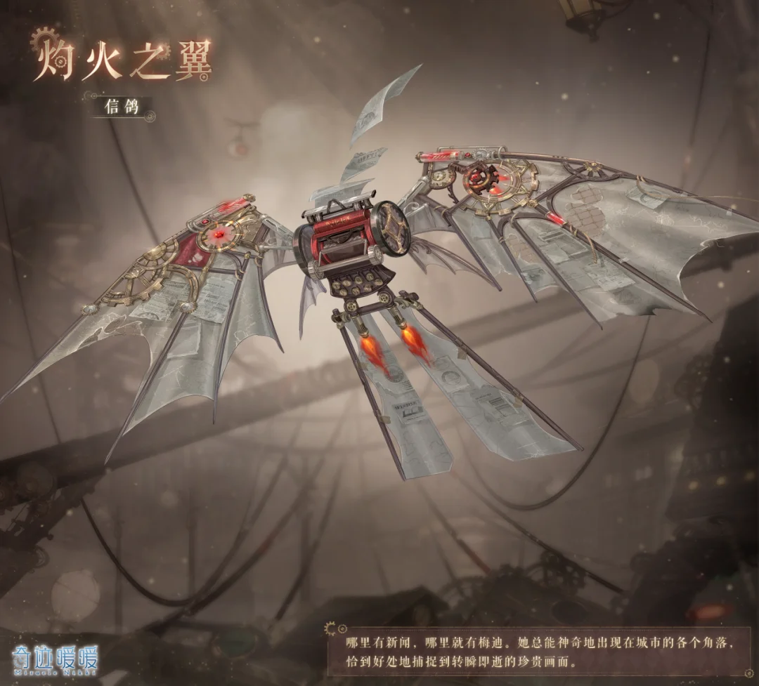 新闻发生之地,必有她的身影。【灼火之翼】套装塑造了一位名为梅迪的传奇记者。她总能凭借灵巧的机械装备,出现在城市的各个角落,用镜头定格真相。套装风格更侧重于都市谍报与敏捷机动特性,充满了现代机械感。