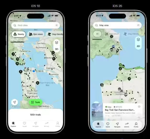 此次更新引入展示的应用包括 AllTrails、Carrot Weather、Fantastical、Kroger、SketchPro、Trello 以及 Le Monde 等多款热门应用的案例,并呈现在标签栏、工具栏、弹出式菜单及独立搜索按钮等元素在液态玻璃风格下的视觉表现。该设计采用半透明、具光学折射感的材质,使界面更通透流畅,并随交互产生动态高光响应。