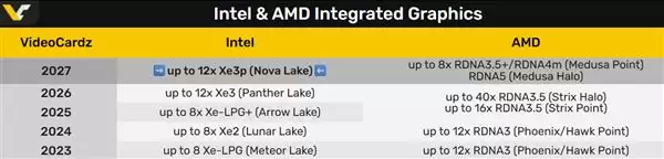 AMD方面的下一代核显目前说法比较乱,移动端主流的Medusa Point预计是RDNA 3.5+,并结合部分RDNA 4的技术,而高端的Medusa Halo甚至可能用上RDNA 5。