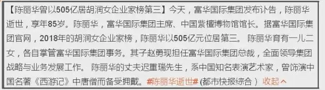 关于陈丽华的遗产状况,此前有爆料称她早在几年前就已经提前立了遗嘱,目的是防止子女争夺资产,传言称子女每人平分100亿,剩下的归属迟重瑞。根据讣告文,陈丽华名下拥有的核心财产主要有两处,一个是富华国际集团,她生前担任名誉主席,一个是中国紫檀博物馆,生前担任馆长。