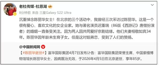 4月7日,富华国际集团发布讣告宣布陈丽华女士因病医治无效在京逝世,享年85岁。消息一出,不少网友立马联想到她的巨额遗产如何处置,二婚丈夫迟重瑞能分多少?迟重瑞是老版《西游记》唐僧的扮演者之一。198