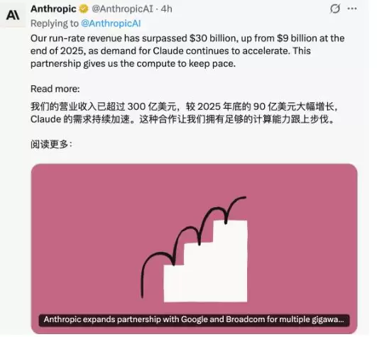 北京时间4月7日,美国大模型头部公司Anthropic对外公布,公司年化收入(ARR)超过300亿美元,较2025年底的90亿美元大幅增长,Claude需求持续加速,已超过行业披露的OpenAI年化