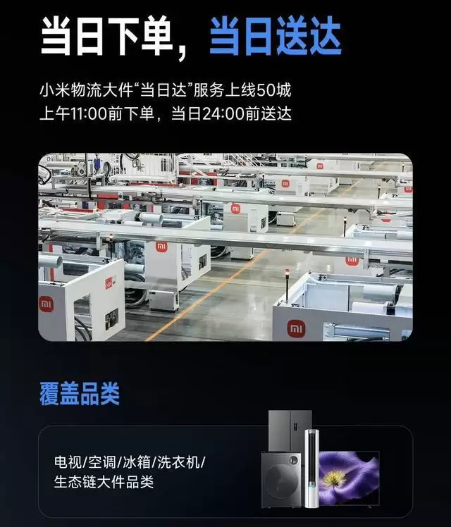 4月6日,小米服务宣布小米物流大件商品“当日达”服务上线50城,覆盖北京、上海、广州、深圳、杭州、成都、天津、重庆、沈阳、西安、南京、郑州、武汉等全国50个核心城市。