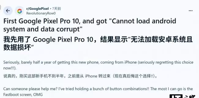 此次重启门波及范围极广,从老款的Pixel 6到最新的Pixel 10系列均有用户中招。具体表现各异:有的设备直接黑屏无法启动,有的反复进入恢复模式(Recovery Mode),还有的会在屏幕上显示“Android系统可能已损坏”的警示信息,令用户担忧数据安全。