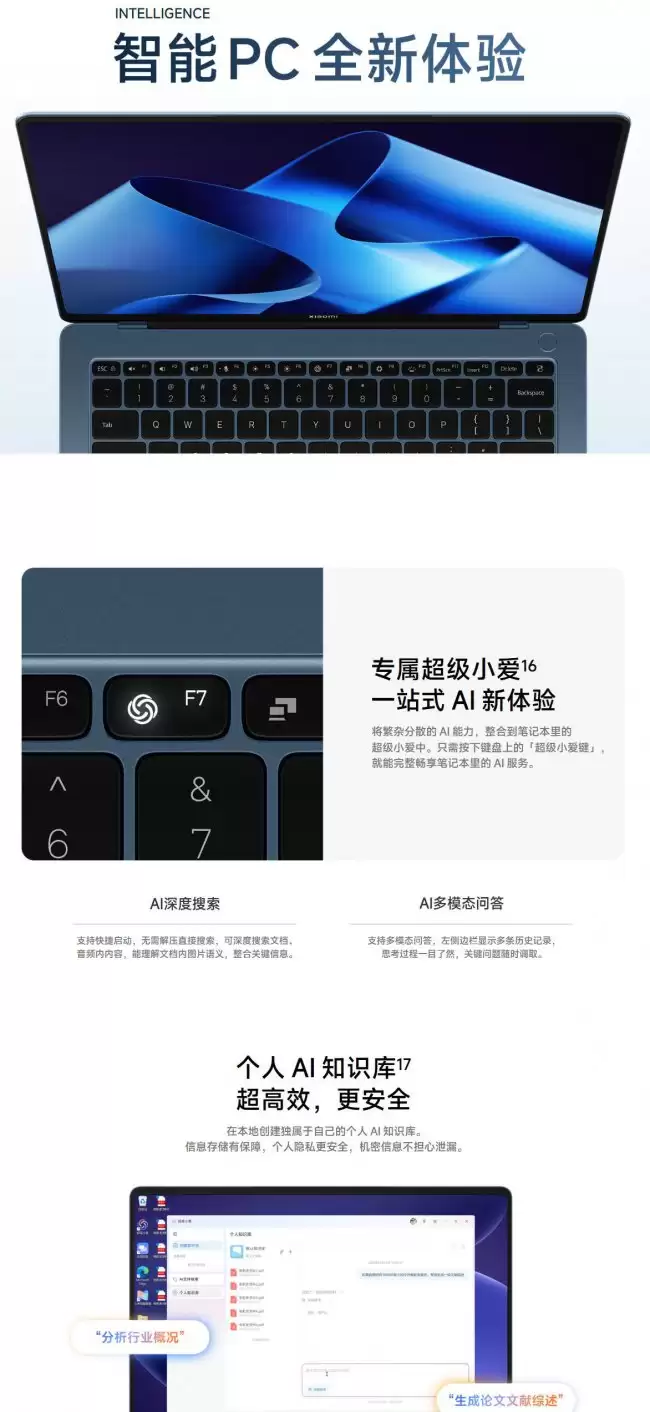 本次更新的核心亮点,在于笔记本键盘上那颗专属的「超级小爱键」。一键唤醒,即可开启强大的本地AI助理功能。它主要集成了三大核心能力:AI深度搜索、AI多模态交互对话,以及个人专属AI知识库的创建与管理。