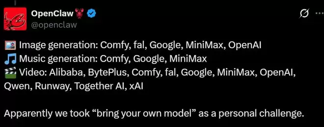 在供应商支持方面,OpenClaw这次展现了强大的兼容性。视频生成支持包括Wan、Runway、Google、MiniMax、OpenAI、Qwen等在内的十余家提供商;音乐生成则接入了Google Lyria、MiniMax和ComfyUI;图片生成也同样覆盖了多家主流服务。