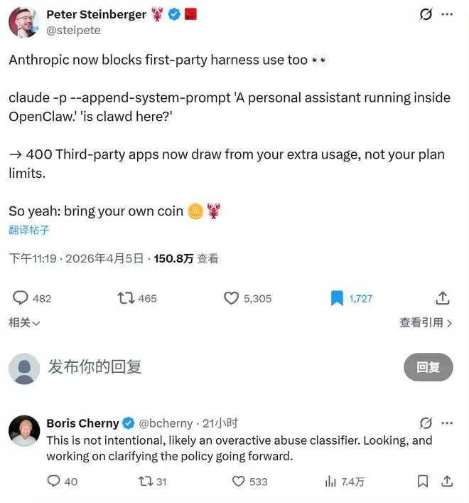 更有意思的后续发生在社交媒体上。版本更新后,Claude Code之父Boris Cherny空降到了OpenClaw创始人Peter Steinberger的评论区。这可不是偶然,因为在更新前一天,Peter刚刚揭露了Anthropic的一个“小心机”:如果你在使用Claude Code等自家工具时,系统提示词里一旦出现“OpenClaw”,请求就会被拒绝,并弹出一个关于“第三方应用用量扣除”的报错。