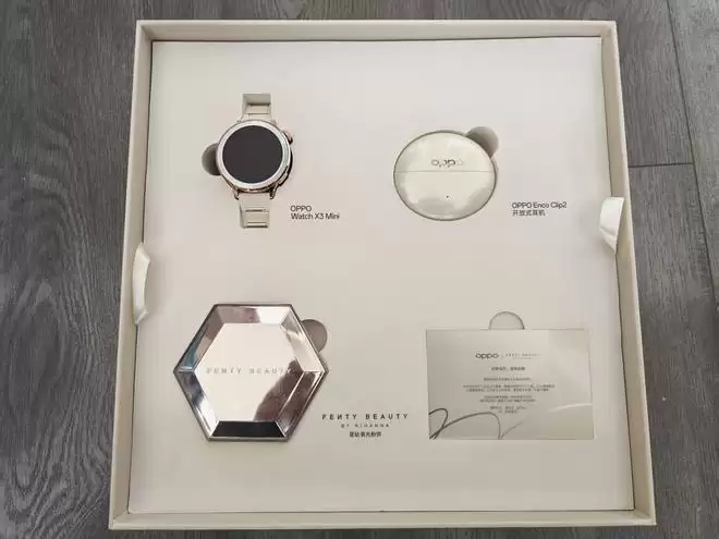 打开这份礼盒,鎏金色的惊喜跃然眼前。OPPO Watch X3 Mini(高光金)与 OPPO Enco Clip2(高光金)两款新品联袂登场,将 “闪耀如金,每一面都高光” 的理念融入方寸设计。它们的存在,早已超越了单纯的工具属性:既是职场干练穿搭的画龙点睛之笔,也是生活松弛状态下的质感陪伴,目的就是让佩戴者在日常中自带光芒。礼盒中,FENTY BEAUTY 星钻高光粉饼与印着“你的光芒,自有回响”的寄语卡片,则将“高光”这一主题从科技延续到妆容,形成了完美闭环。