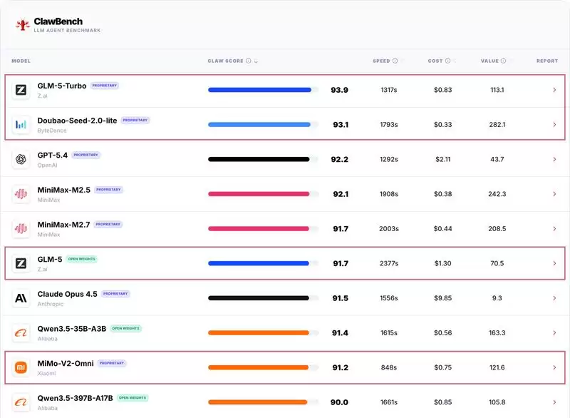 先说几个核心判断。从榜单结果看,最大的亮点无疑是来自中国企业的集中发力。北京的人工智能企业智谱、字节跳动和小米,旗下共有四款模型成功跻身全球前十,这无疑是中国AI研发实力的一次集中展示。具体来看,智谱的GLM-5-Turbo以93.9的高分拔得头筹,占据了全球第一的位置。而字节跳动的豆包模型Doubao-Seed-2.0-lite紧随其后,位列全球第二。更有意思的是,这款模型同时还有一个突出的优势——它是全榜单中使用成本最低的模型,这无疑为大规模商业化应用铺平了道路。