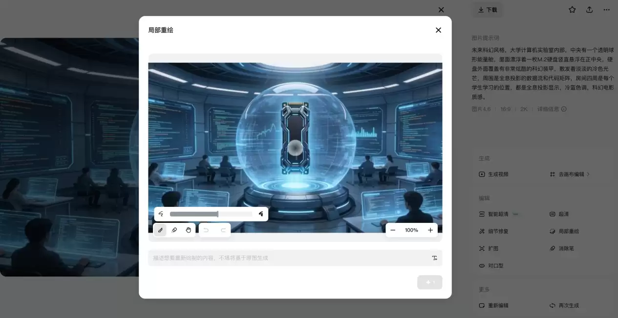 AI 出的图不一定一次到位。用即梦的局部重绘功能,单独调整产品在画面中的位置、比例和光效,让它更自然地融入场景。如果效果不佳也别急,也可以多跑几次,选出最满意的那张。