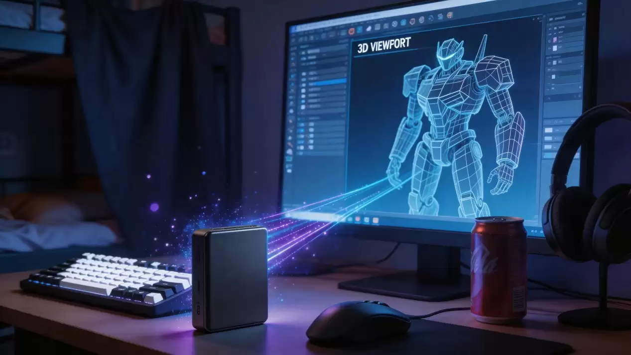 提示词:微缩科幻场景,大学生宿舍桌面特写,键盘旁摆放着一个小巧的黑色磨砂移动固态硬盘,硬盘周围散发蓝紫色粒子光效,数据流从硬盘飞向显示器屏幕,屏幕上显示3D建模画面,暗色调搭配霓虹点缀,赛博朋克氛围。