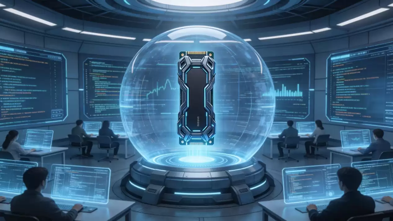 提示词:未来科幻风格,大学计算机实验室内部,中央有一个透明球形能量舱,里面漂浮着一枚黑色M.2 SSD固态硬盘,周围是全息投影的数据流和代码矩阵,冷蓝色调,科幻电影质感。
