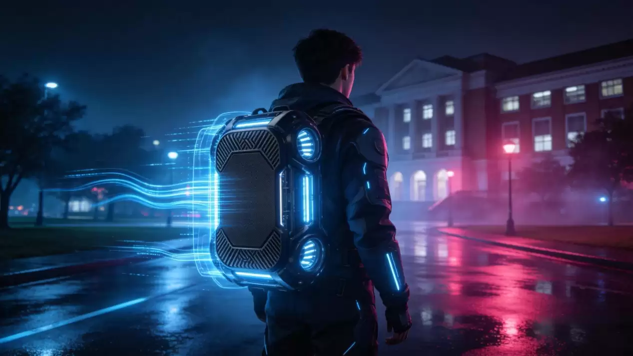提示词:赛博朋克未来主义摄影,深夜,大学校园,未来感,超写实 8k 细节。一名身穿科技感机能服的男大学生背影。他背着一个由移动固态硬盘演化而来的巨大的高科技背包,黑色磨砂碳纤维质感,外壳刻有精细的发光纹路。背包侧面环绕着半透明的蓝色全息数据流和流动的能量灯条。环境充满了深蓝与品红的体积光,路面雨后积水倒映着绚烂的霓虹,空气中弥漫着淡淡的科幻雾气,电影级宽画幅。