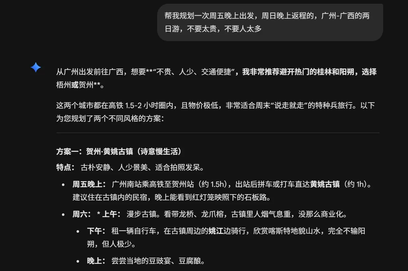 以一次周末出游规划为例。虽然在广州生活多年,却未曾好好游览周边,于是向千问提出需求:规划一个去广西的周末两日游。