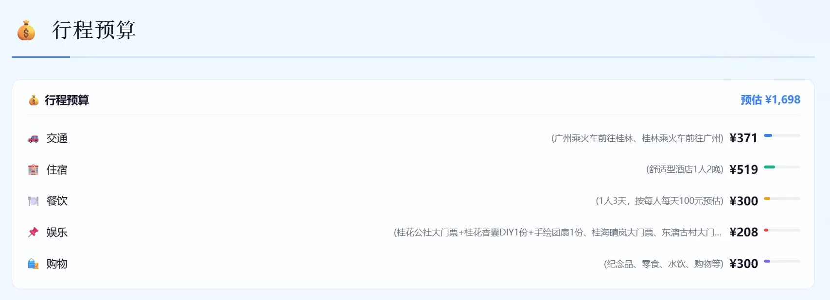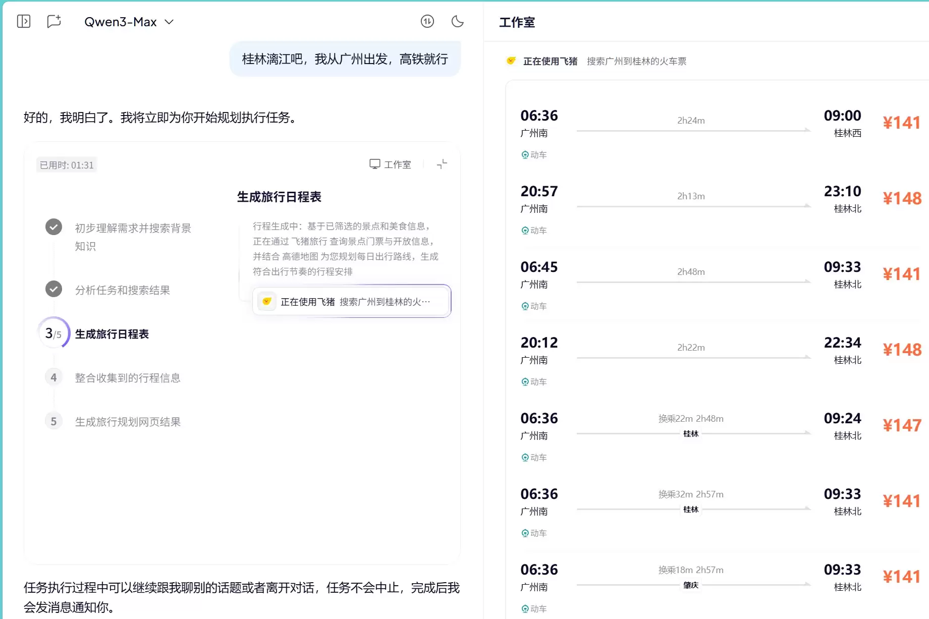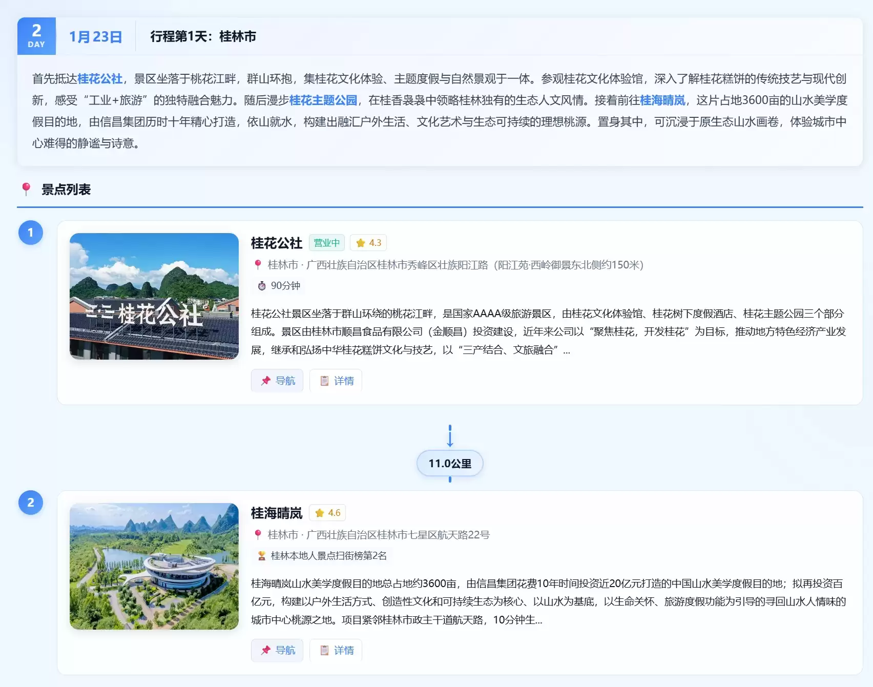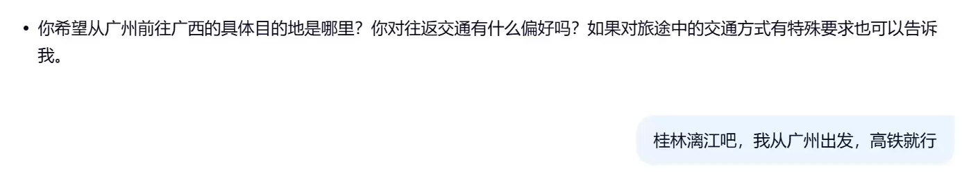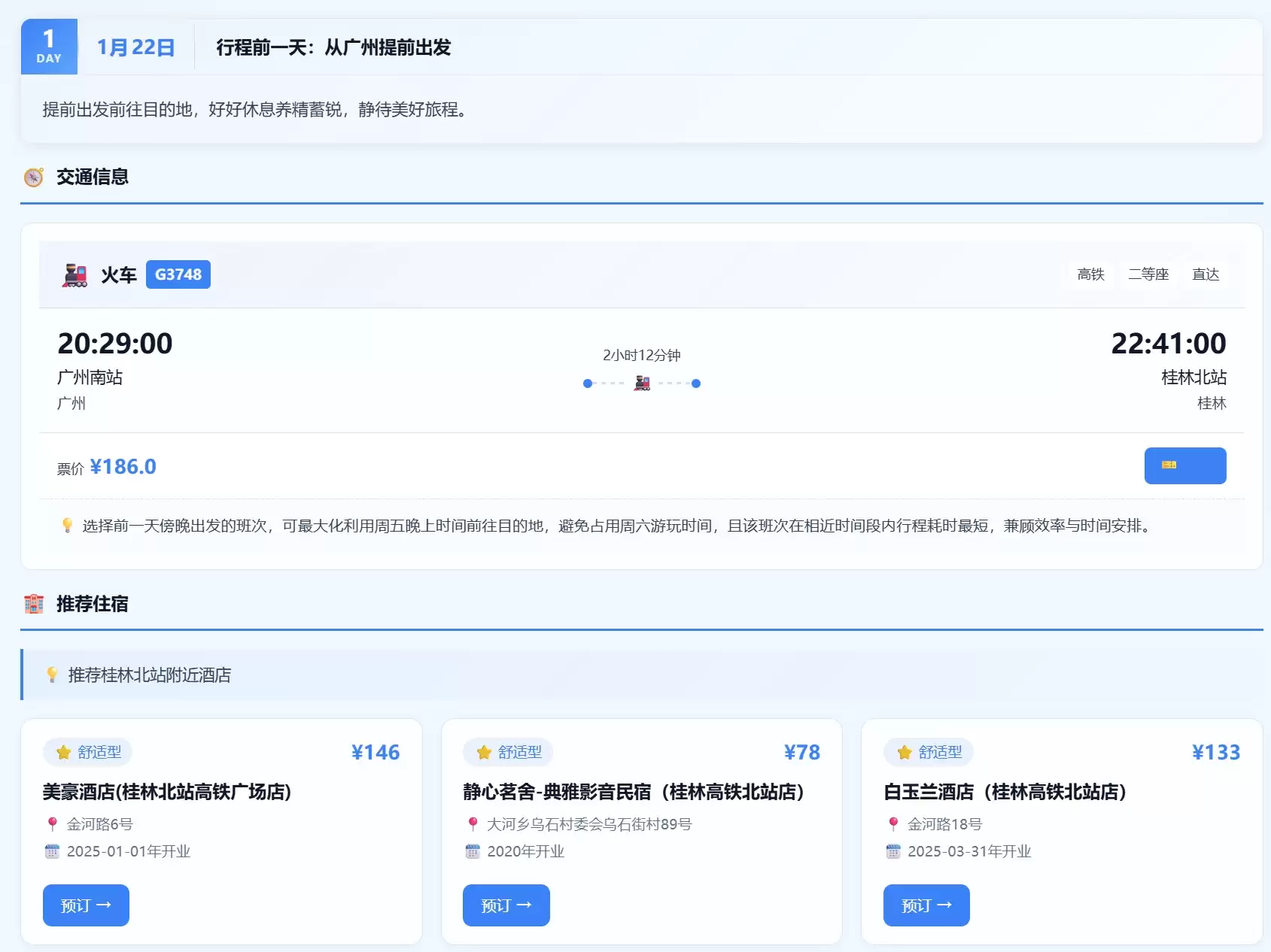 大约五分钟后,一份详尽的两日行程规划出炉。方案显示,将从1月22日晚乘高铁出发,22点抵达桂林并入住车站附近,每一步都支持直接点击跳转订票、订房。