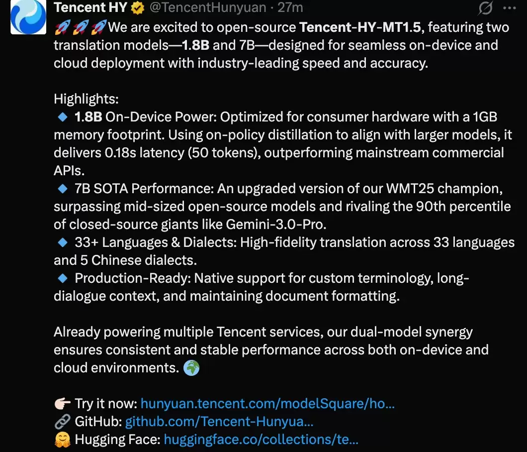 腾讯正式宣布开源其混元翻译模型HY-MT的1.5版本。这不仅仅是一次简单的版本迭代,更是一场针对端侧翻译场景的降维打击。一套支持33种语言互译的强大方案,正试图将服务器级别的翻译能力,直接塞进用户的口袋里。