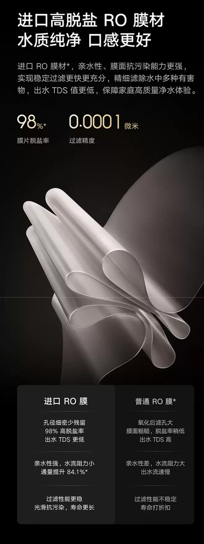 从官方释放的产品信息来看,这款净水器的过滤性能是其主要着力点。它的过滤精度号称可以达到0.0001微米级别,这个数字意味着什么呢?基本上水中的细菌、病毒都难逃滤网。具体来说,其宣称能滤除高达145种污染物,对重金属铅的去除率宣称达到99.9%,对PFAS&PFOA这类持久性有机污染物的去除率也有99%。这背后,进口的高脱盐率RO膜材是关键,这种膜材在亲水性和抗污染能力上通常更强,也直接带来了更低的出水TDS值,旨在为家庭用户提供更高质量且稳定的净水体验。
