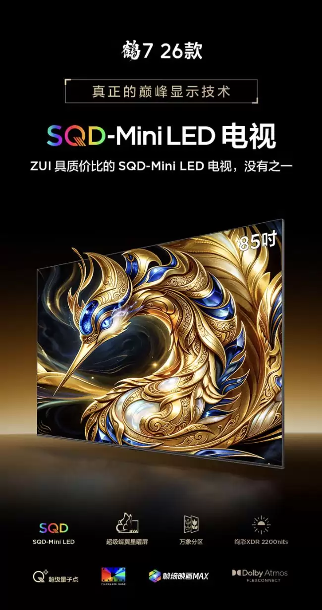 硬件方面,这次鹤7系列可以说下了不少功夫。全系标配了一块3840x2160分辨率的SQD Mini LED面板,刷新率达到150Hz,并且支持动态加速到300Hz,这意味着无论是观看高速运动的球赛,还是连接游戏主机,画面都会更加丝滑流畅。分区背光数量上,尺寸越大,配置也越足:65英寸款有646个分区,75英寸款是760个,85英寸款则达到了1056个,至于98英寸的旗舰型号,更是给到了1152个分区。高分区带来的好处显而易见,画面控光会更精细,暗场细节也更清晰。