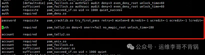 auth required pam_tally2.so deny=5 notallow=fail no_magic_root unlock_time=180