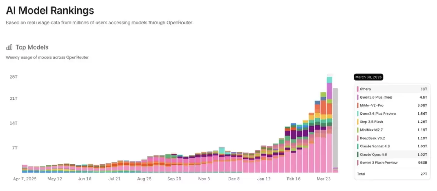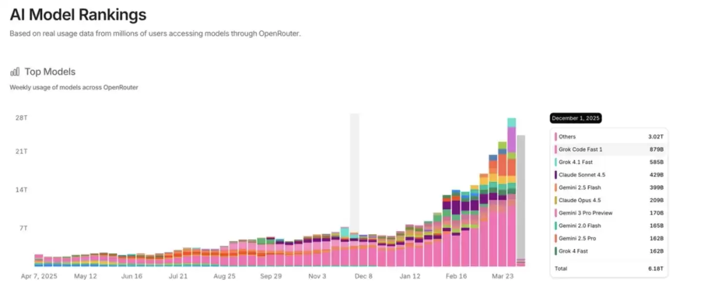 OpenRouter上的模型使用统计数据,清晰地印证了这一点。