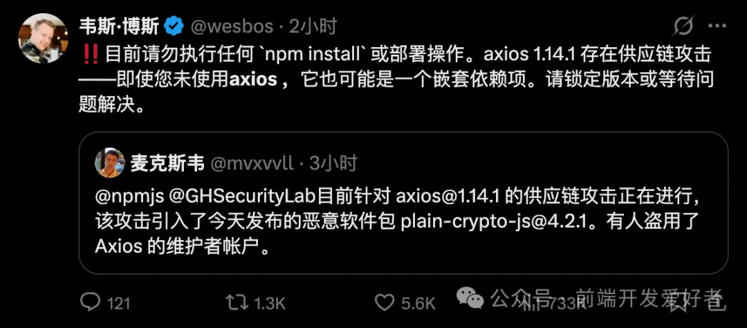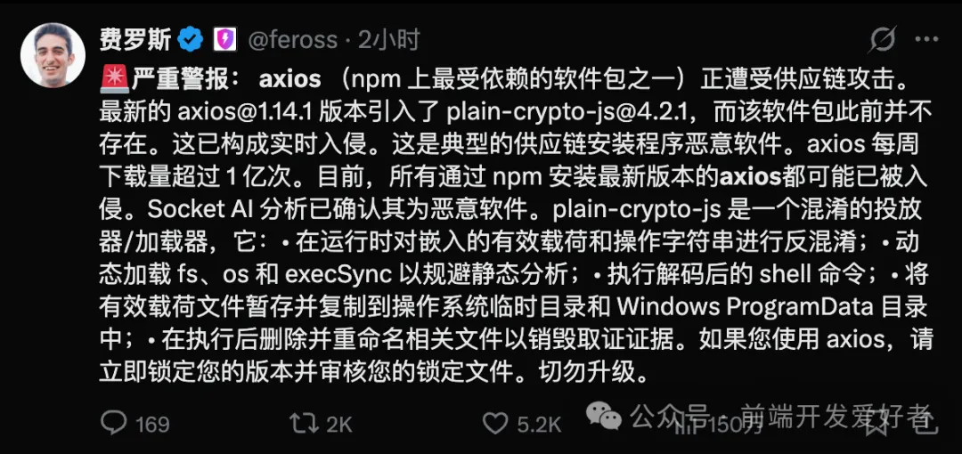 Axios投毒事件:这不是演习,是供应链攻击的“工业级”升级 最近几天,整个前端社区的后背可能都有些发凉。一场席卷npm生态的供应链攻击风暴,远比我们想象的更猛烈、更专业。 就在CanisterWorm这个自传播蠕虫病毒还在不断感染新包、弄得人心惶惶时,一个更重磅的消息传来:我们几乎每天都在用的请求