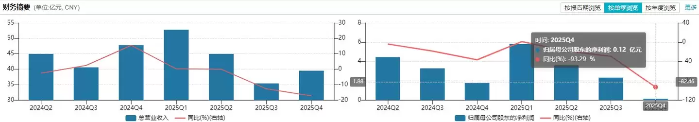 从单季度数据看,第一至第三季度,归母净利润分别为5.82亿元、3.63亿元和2.32亿元。利润虽呈逐季下滑趋势,但至少保持了账面盈利。然而,进入第四季度,形势急转直下,归母净利润骤降至千万元级别,扣非后直接转为亏损。