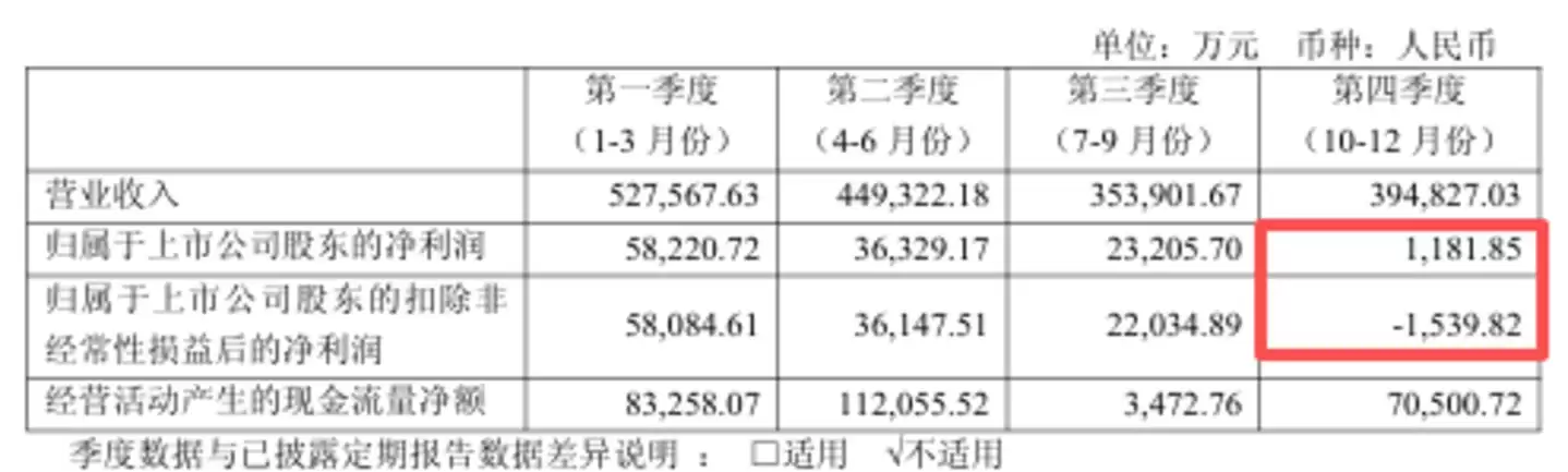 更值得关注的是其季度业绩的剧烈波动。前三季度归母净利润累计已达11.78亿元,而第四季度单季仅实现1181.85万元,扣除非经常性损益后更是直接亏损1539.82万元。这种断崖式的季度利润下滑,让市场对其第四季度是否存在“财务洗澡”行为产生疑虑。