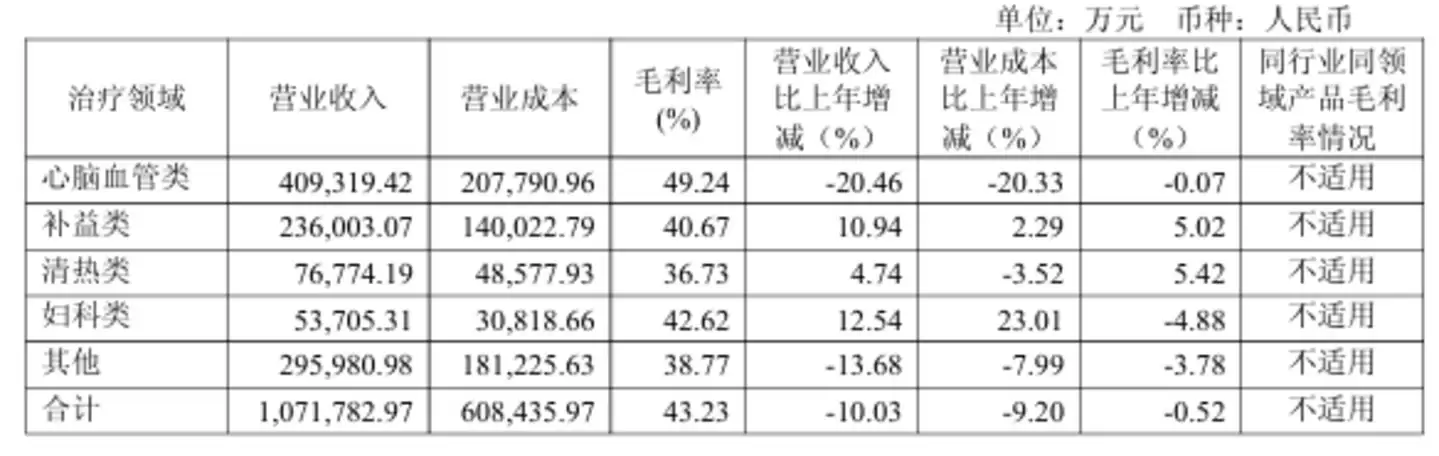 2025年,心脑血管类产品收入仅为40.93亿元,同比大幅下降20.46%。以安宫牛黄丸为代表的拳头产品销量持续走低,成为拖累整体业绩的主要因素。尽管同期补益类和妇科类产品收入分别增长了10.94%和12.54%,但由于这些品类规模相对较小,完全无法弥补心脑血管产品下滑造成的巨大缺口。