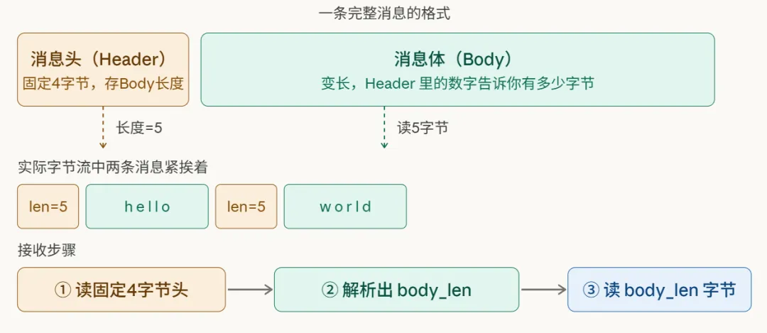这是工程实践中应用最广泛的方案。它的思路是:在真正的消息体前面,附加一个固定长度的“消息头”,这个头里最重要的信息,就是声明后续消息体的长度。接收方先读固定长度的头,解析出长度值,再精确读取相应字节数的消息体。