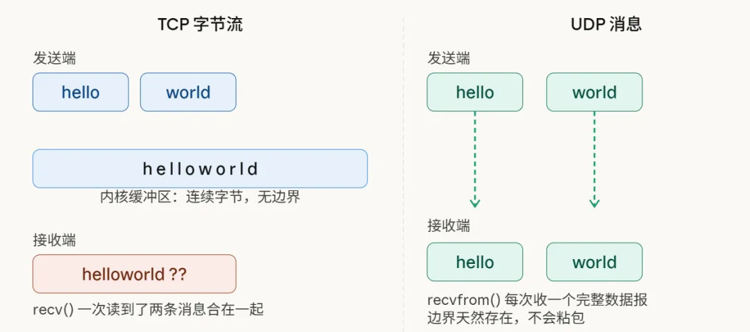 UDP像是寄信,你投递一个包裹,对方收到的是一个完整的包裹,边界天然分明。而TCP则像是架设了一条源源不断的水管,你这一端往里倒水,对方接到的只是连续的水流,至于你是一次性倒完,还是分几次倒,水流本身并不会告诉你。