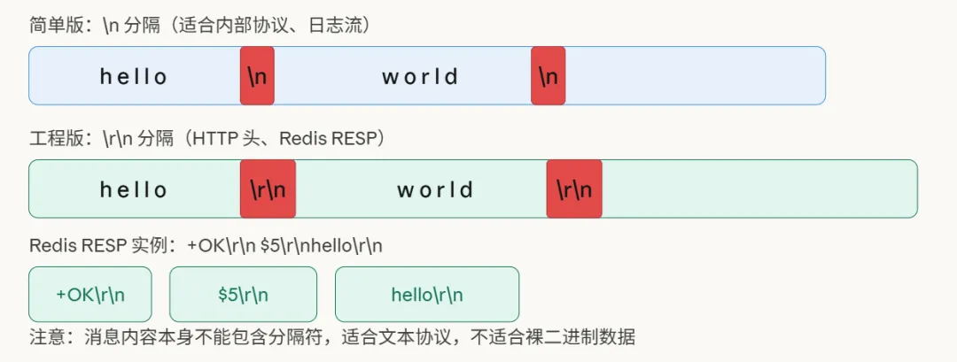 约定一个(或一组)特殊字符作为消息的结束标志。最简单的比如换行符\n,而实际工程中更常见的是\r\n(CRLF,即回车加换行)。HTTP协议的头部分隔、Redis的RESP协议,采用的都是\r\n。