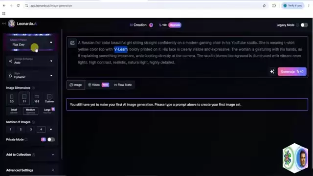 最关键的一步:在提示词(Prompt)输入框中,详细描绘你想要的AI头像特征。描述越具体,结果越贴近想象。例如,你可以输入:“一位自信直视镜头的金发俄罗斯美女,笔直地坐在YouTube工作室的现代电竞椅上。她身穿印有醒目‘V-Learn’字样的黄色T恤,面部表情清晰生动,正在用手势讲解重要内容。背景是模糊的工作室,点缀着 vibrant 的霓虹灯光。整体要求高对比度、写实风格、自然光线且细节丰富。”