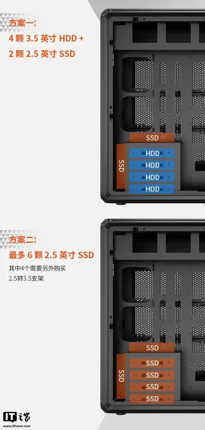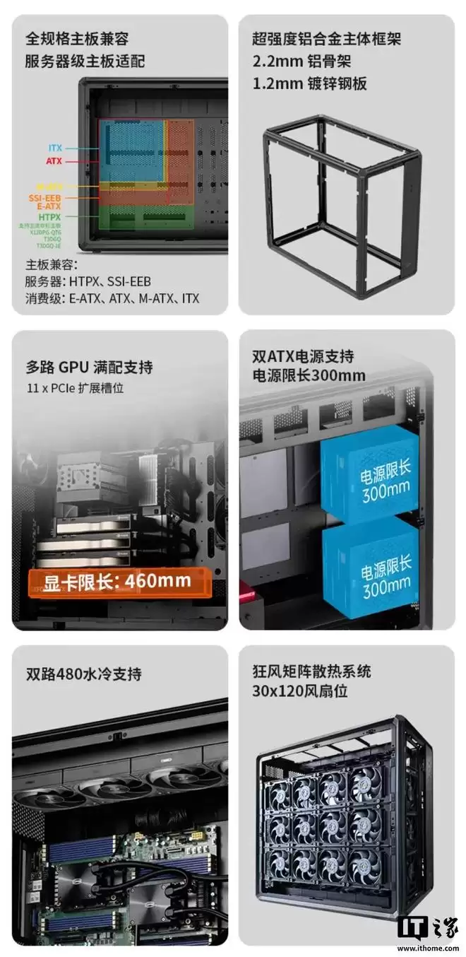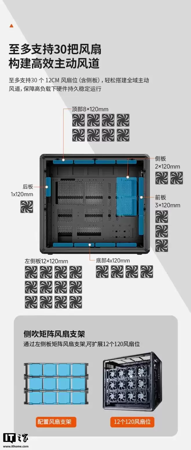 散热设计更是这款机箱的重头戏。它最多可以安装30个120mm风扇!具体分布是:前部3把(兼容360mm水冷)、侧板2把、底部4把、左侧板12把、后板1把、顶部8把(兼容双480mm水冷)。如果这还不够,用户还能通过选购额外的风扇支架,再增加12把风扇。这种级别的风道配置,堪称是为极限散热和静压风道而生的。