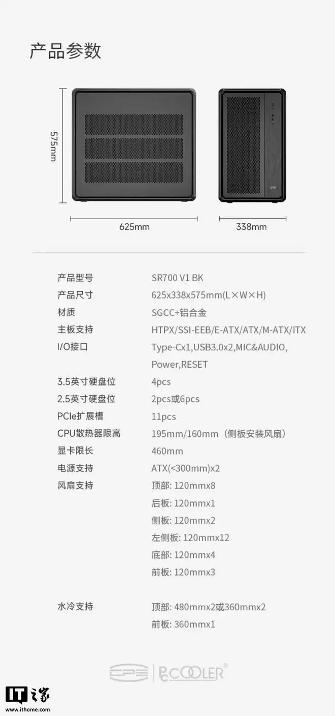 超频三南岳SR700全塔工作站机箱上架,兼容性与扩展性拉满 最近,超频三在天猫平台上架了一款面向工作站和高端玩家的新机箱——南岳SR700。目前商品页显示的还是占位符价格,但产品的基本规格和设计已经一览无余。 这款机箱最大的亮点,无疑是其惊人的兼容性。它不仅能轻松容纳HTPX、SSI-EEB这类服务