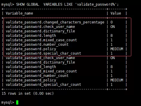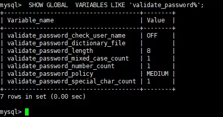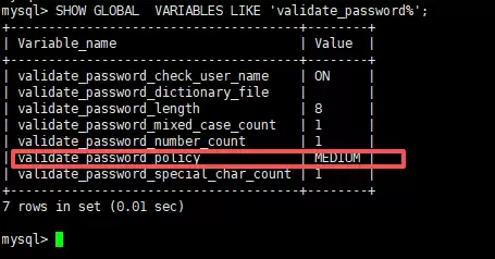 mysql> SHOW GLOBAL VARIABLES LIKE 'validate_password%';